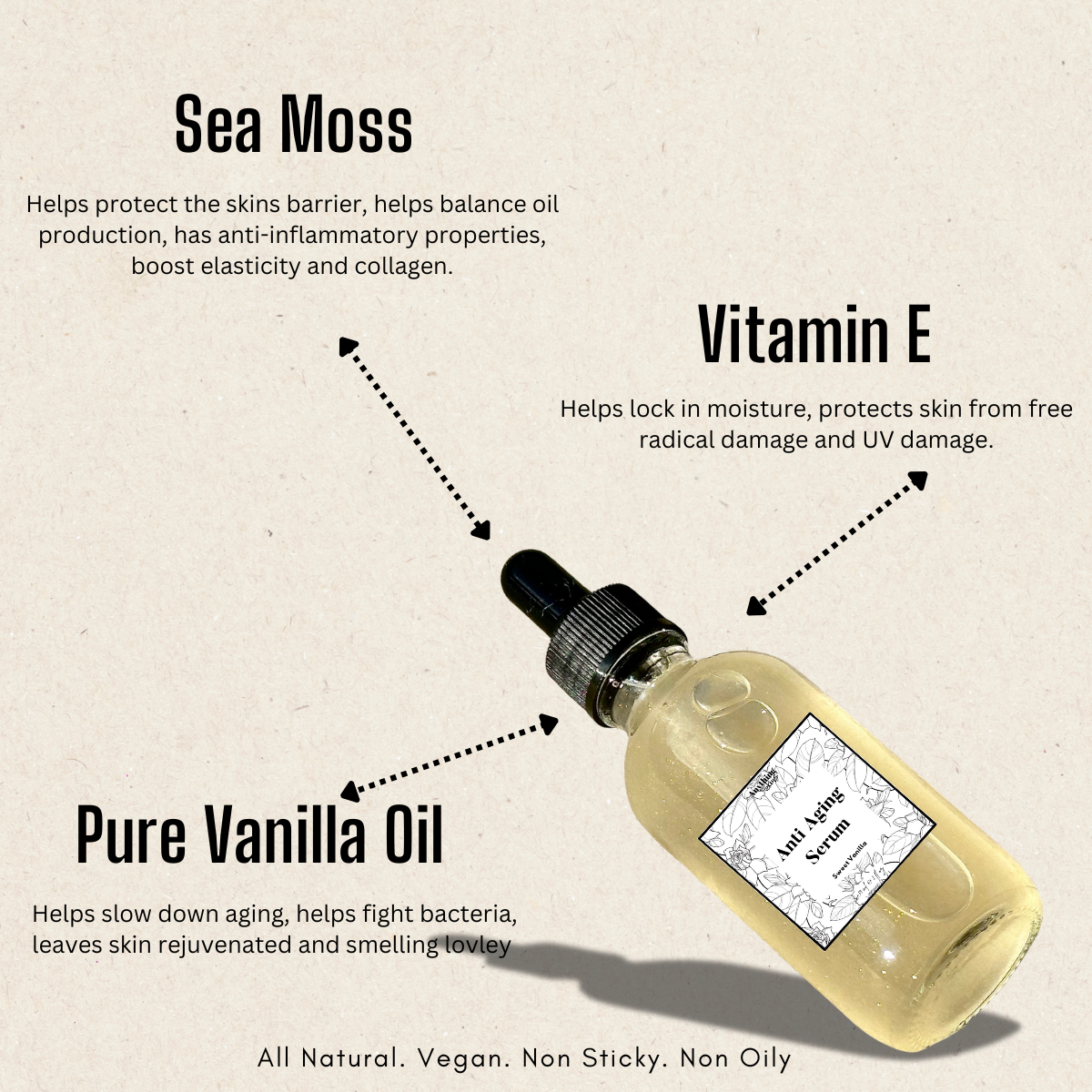 Distilled Chondrus Crispus (Sea Moss), Brassica napus (v. glycerin), vanilla oleoresin (vanilla oil), alpha-tocopherol (vitamin e), Preservative
